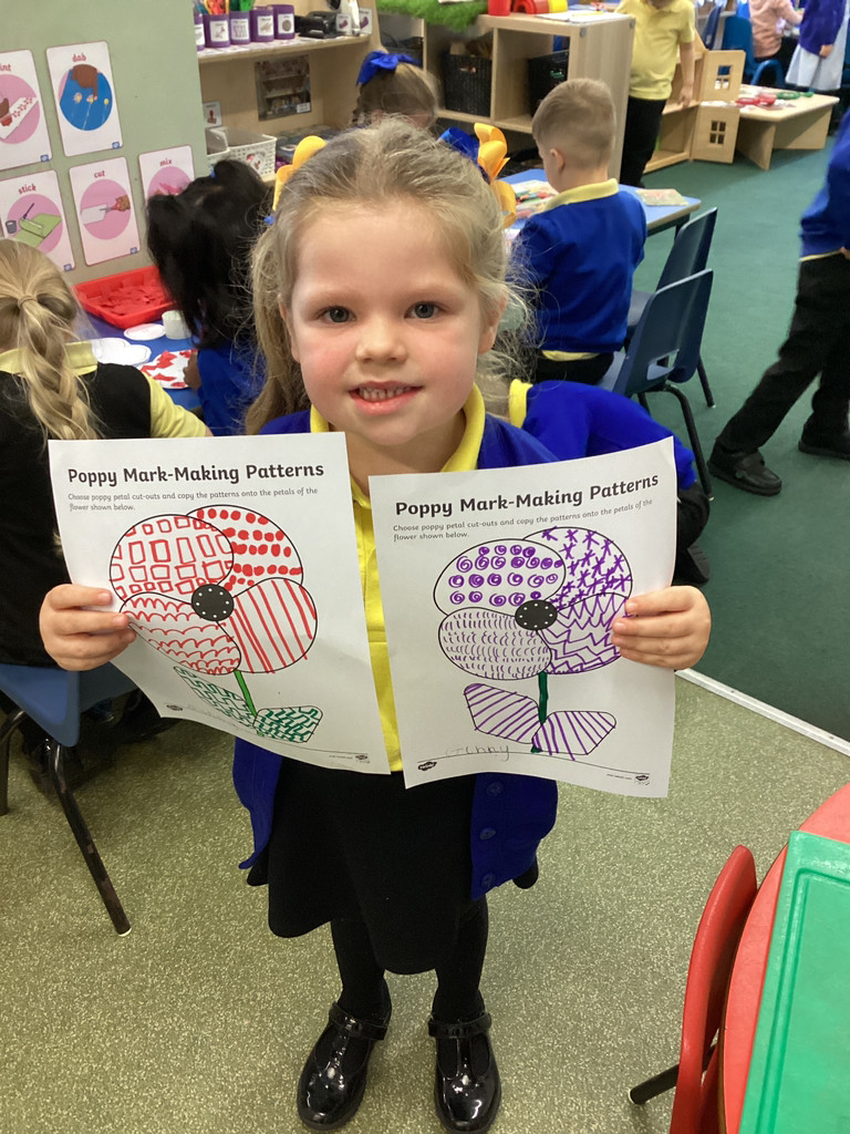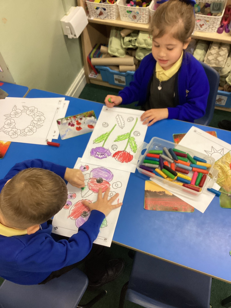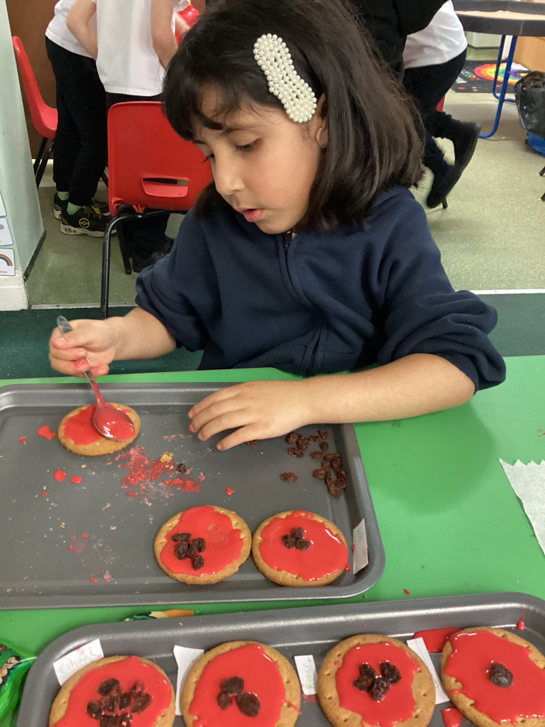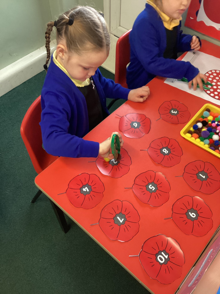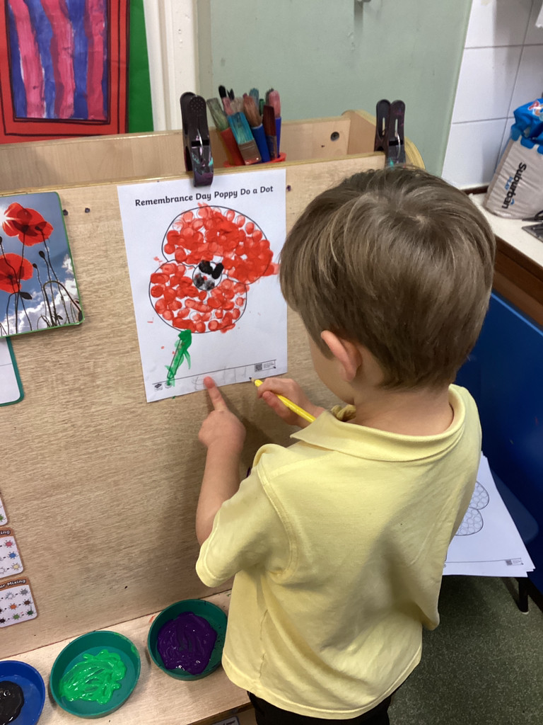 We learn about the importance of Remembrance Day and celebrate through focused activities within provision. The children could decorate poppies through mark making, finger painting or tissue paper collage art. They could colour in poppies, count poppies on ten frames, continue simple poppy patterns and build poppies out of cubes. The children understand that purple poppies are also worn to remember the animals, so we represented both colours through our creations. We finished our celebrations with biscuit decorating.