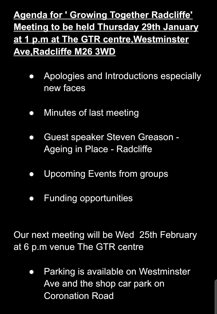 Growing Together Radcliffe is based in the ROC Centre on Westminster Avenue, Radcliffe. This not-for-profit community interest company provides a welcoming, safe, and inclusive space for all. It offers vital support services for vulnerable individuals and families, including food assistance through a referral-based food bank, “Live Well” activities for those with long-term health conditions, and intergenerational workshops that connect people across age groups. The organisation hosts community events to promote social inclusion, supports the Bury “Let’s Do It” Strategy, and provides space for local groups, classes, and services.